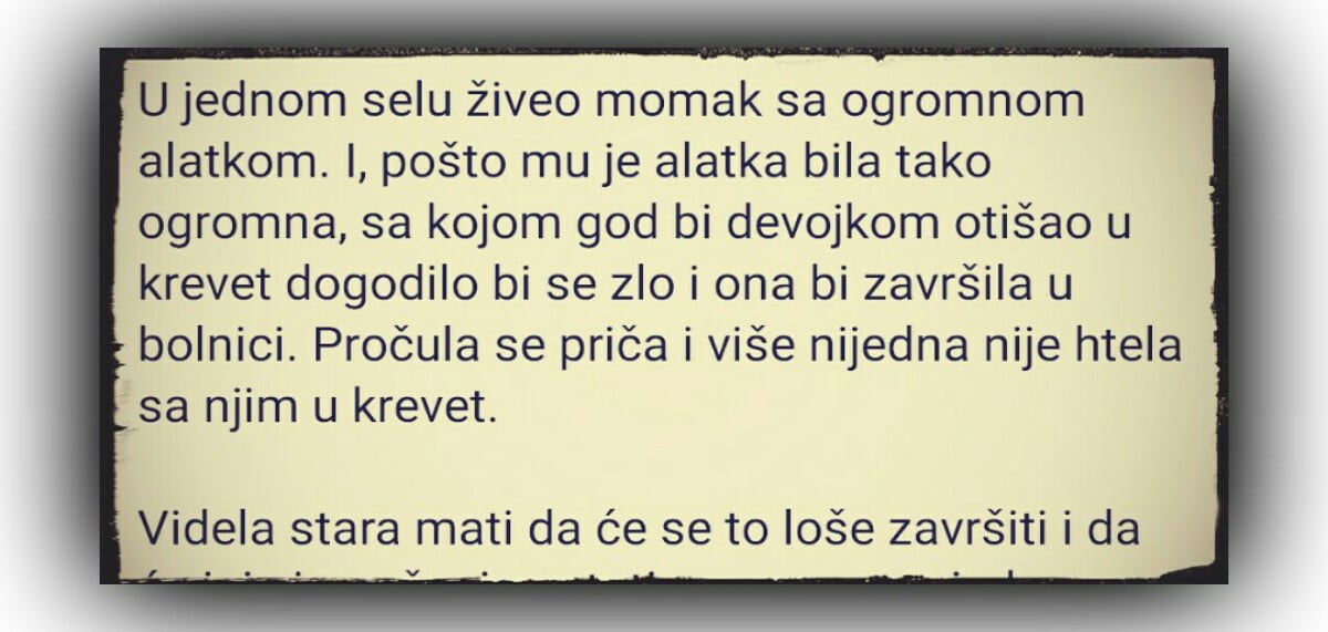 U jednom selu živeo momak sa ogromnom alatkom. I, pošto mu je alatka bila tako ogromna, sa kojom god bi devojkom otišao u krevet dogodilo bi se zlo i ona bi završila u bolnici. Pročula se priča i više nijedna nije htela sa njim u krevet.
