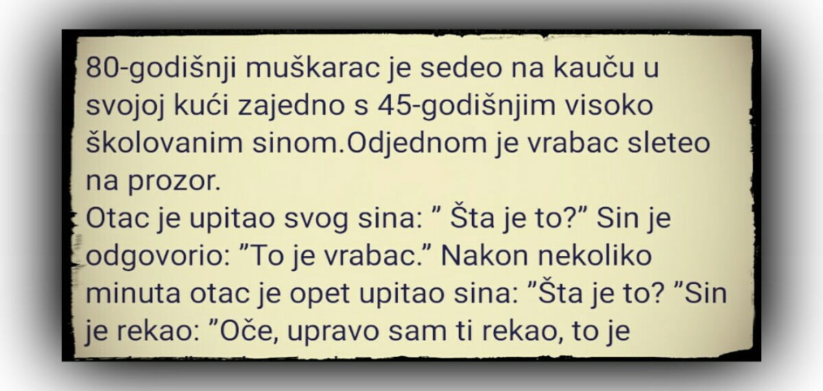 80-godišnji muškarac je sedeo na kauču u svojoj kući zajedno s 45-godišnjim visoko školovanim sinom.Odjednom je vrabac sleteo na prozor.