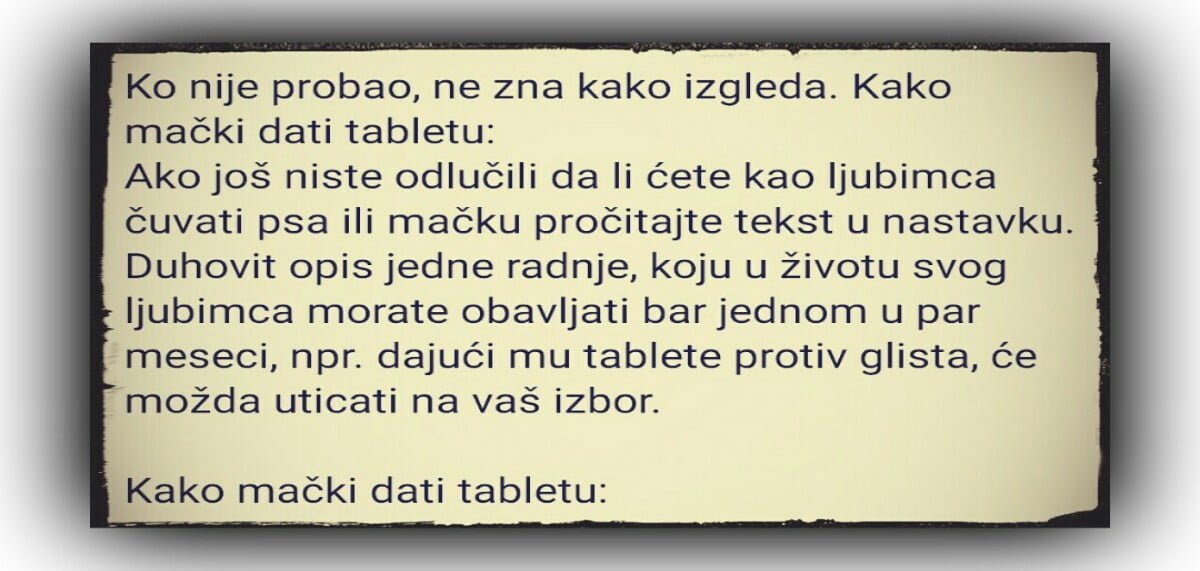 Ako još niste odlučili da li ćete kao ljubimca čuvati psa ili mačku pročitajte tekst u nastavku. Duhovit opis jedne radnje, koju u životu svog ljubimca morate obavljati bar jednom u par meseci, npr. dajući mu tablete protiv glista, će možda uticati na vaš izbor.