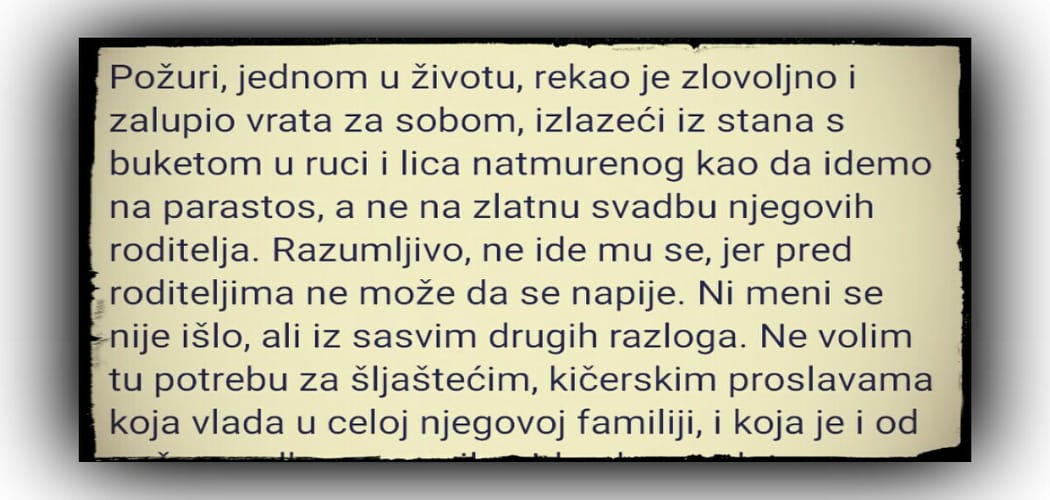 Požuri, jednom u životu, rekao je zlovoljno i zalupio vrata za sobom, izlazeći iz stana s buketom u ruci i lica natmurenog kao da idemo na parastos, a ne na zlatnu svadbu njegovih roditelja. Razumljivo, ne ide mu se, jer pred roditeljima ne može da se napije. Ni meni se nije išlo, ali iz sasvim drugih razloga. Ne volim tu potrebu za šljaštećim, kičerskim proslavama koja vlada u celoj njegovoj familiji, i koja je i od naše svadbe napravila cirkusku predstavu, po kojoj će nas generacije pamtiti. Pokupila sam ključeve sa police u predsoblju i pogledala se još jednom u ogledalo. Podočnjaci su i dalje bili tu, i umor se prelivao preko njih, bacajući senku na nekad vesele i nasmejane oči koje su gasnule polako. Zaključala sam i javila se radoznaloj komšinici Zori koja je virila iz susednog stana, tobož nameštajući otirač. Otpozdravila je, ljubopitljivo zagledajući moju svečanu haljinu i štikle, i s neizgovorenim pitanjem na licu.