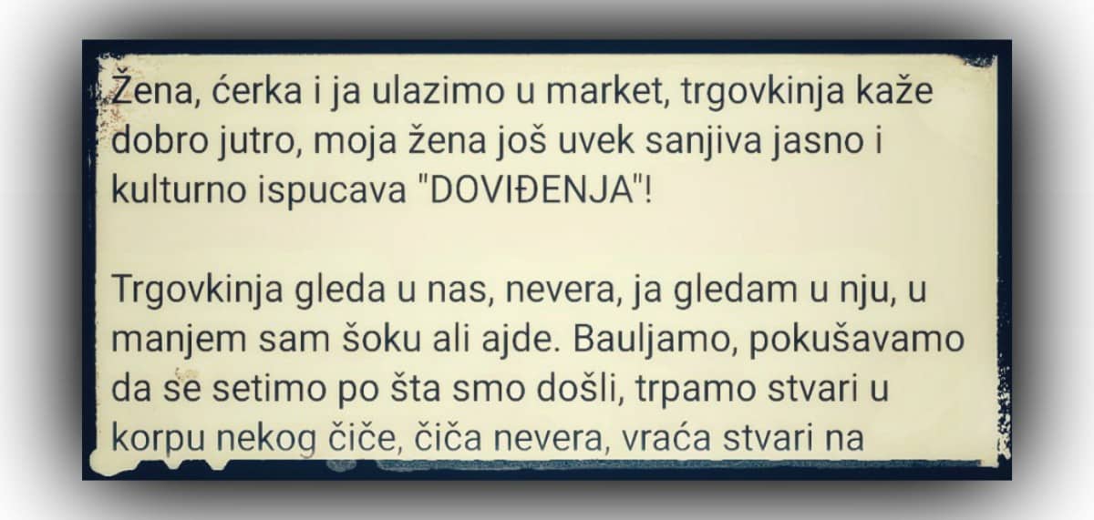 Žena, ćerka i ja ulazimo u market, trgovkinja kaže dobro jutro, moja žena još uvek sanjiva jasno i kulturno ispucava “DOVIĐENJA”!