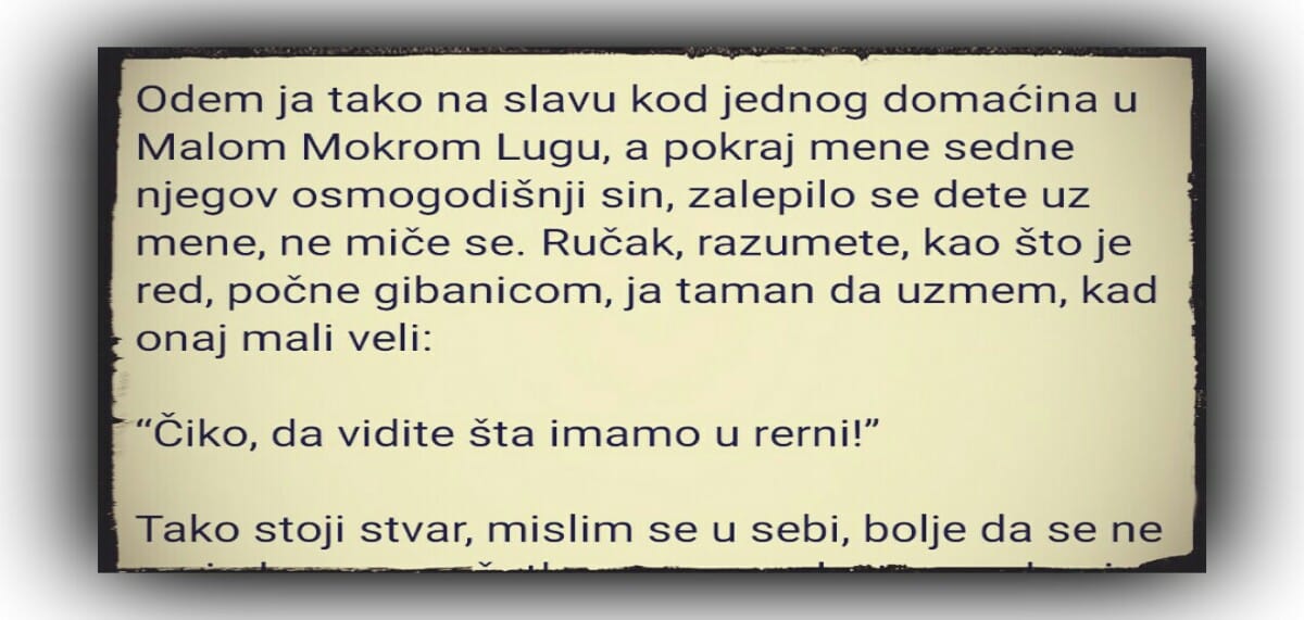 Odem ja tako na slavu kod jednog domaćina u Malom Mokrom Lugu, a pokraj mene sedne njegov osmogodišnji sin, zalepilo se dete uz mene, ne miče se. Ručak, razumete, kao što je red, počne gibanicom, ja taman da uzmem, kad onaj mali veli: