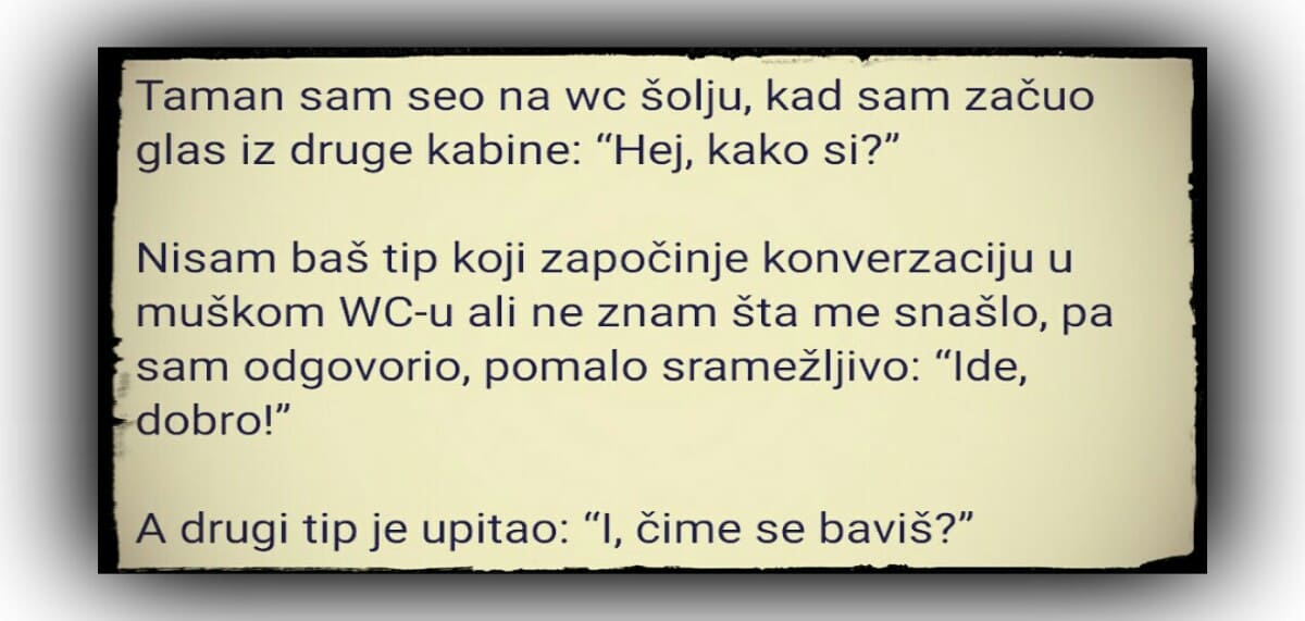 Taman sam seo na wc šolju, kad sam začuo glas iz druge kabine: “Hej, kako si?”