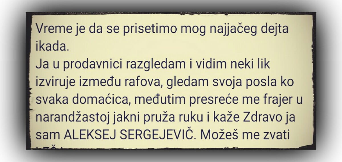 Ja u prodavnici razgledam i vidim neki lik izviruje između rafova, gledam svoja posla ko svaka domaćica, međutim presreće me frajer u narandžastoj jakni pruža ruku i kaže Zdravo ja sam ALEKSEJ SERGEJEVIČ. Možeš me zvati LEŠA.