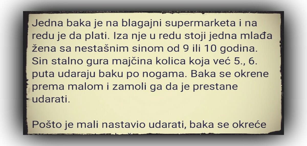 Jedna baka je na blagajni supermarketa i na redu je da plati. Iza nje u redu stoji jedna mlađa žena sa nestašnim sinom od 9 ili 10 godina. Sin stalno gura majčina kolica koja već 5., 6. puta udaraju baku po nogama. Baka se okrene prema malom i zamoli ga da je prestane udarati.