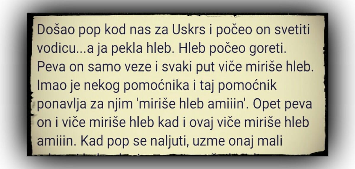 Došao pop kod nas za Uskrs i počeo on svetiti vodicu…a ja pekla hleb. Hleb počeo goreti. Peva on samo veze i svaki put viče miriše hleb. Imao je nekog pomoćnika i taj pomoćnik ponavlja za njim ‘miriše hleb amiiin’. Opet peva on i viče miriše hleb kad i ovaj viče miriše hleb amiiin. Kad pop se naljuti, uzme onaj mali crkveni kalendar i ovog pomočnika pljas po glavi… Ja umrlaaaa smejala sam se ko debil.