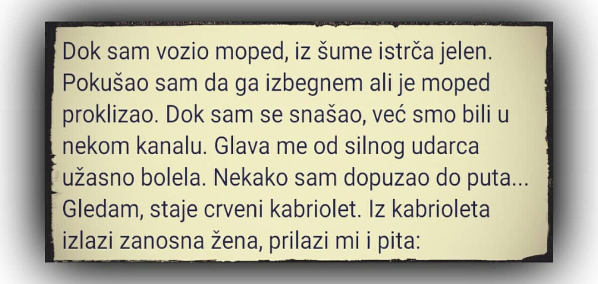 Dok sam vozio moped, iz šume istrča jelen. Pokušao sam da ga izbegnem ali je moped proklizao. Dok sam se snašao, već smo bili u nekom kanalu. Glava me od silnog udarca užasno bolela. Nekako sam dopuzao do puta… Gledam, staje crveni kabriolet. Iz kabrioleta izlazi zanosna žena, prilazi mi i pita: