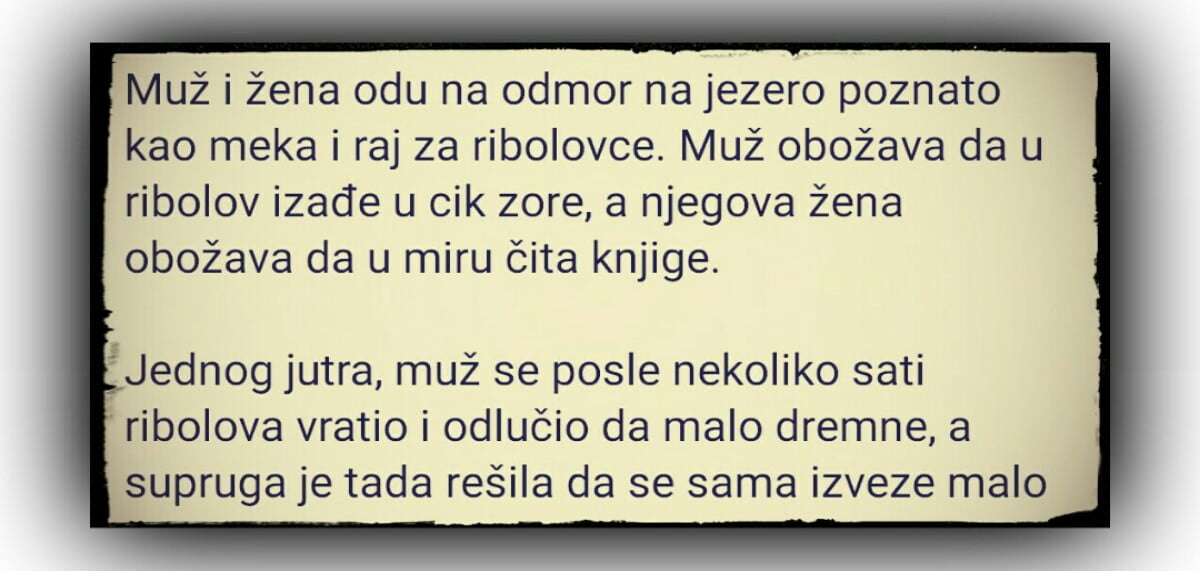 Jednog jutra, muž se posle nekoliko sati ribolova vratio i odlučio da malo dremne, a supruga je tada rešila da se sama izveze malo čamcem na jezero. Upalila motor i izveze čamac na jedno usamljeno mesto, baci sidro, izvadi knjigu i nastavi da uživa u tišini i da čita svoju knjigu. Uskoro naiđe ribolovni inspektor u svom čamcu, pristane uz njen čamac i reče: