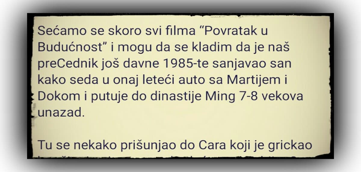 Sećamo se skoro svi filma “Povratak u Budućnost” i mogu da se kladim da je naš preCednik još davne 1985-te sanjavao san kako seda u onaj leteći auto sa Martijem i Dokom i putuje do dinastije Ming 7-8 vekova unazad.