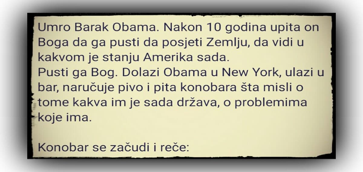 Pusti ga Bog. Dolazi Obama u New York, ulazi u bar, naručuje pivo i pita konobara šta misli o tome kakva im je sada država, o problemima koje ima.
