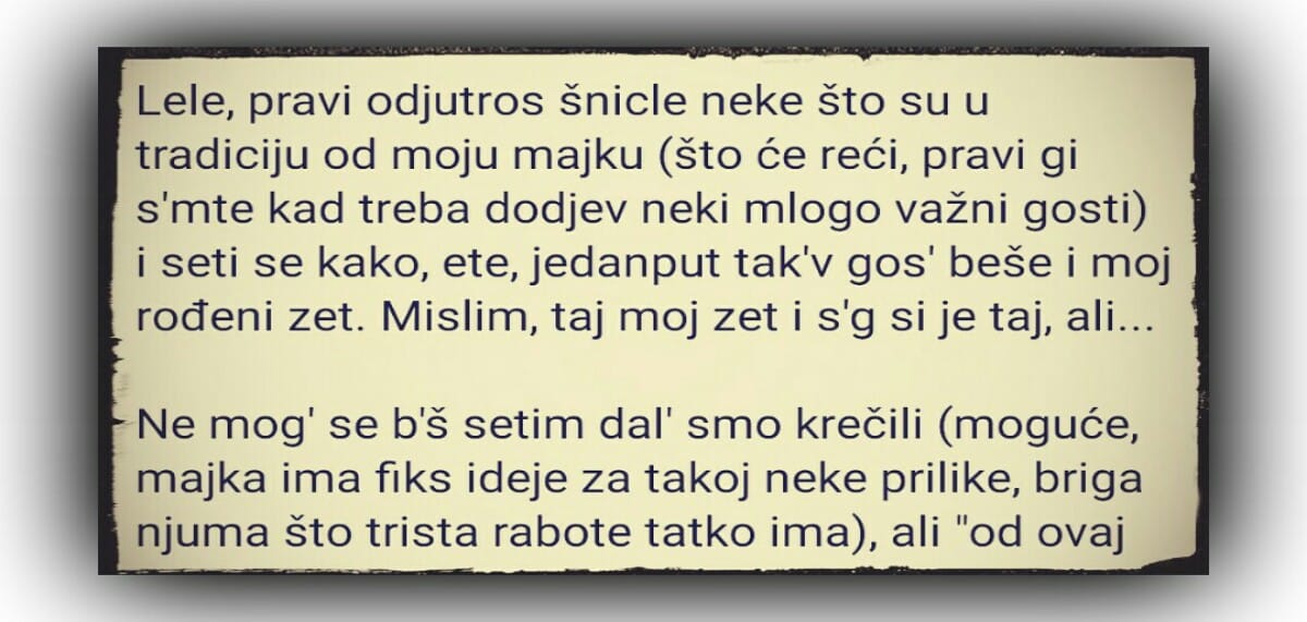 Lele, pravi odjutros šnicle neke što su u tradiciju od moju majku (što će reći, pravi gi s’mte kad treba dodjev neki mlogo važni gosti)…