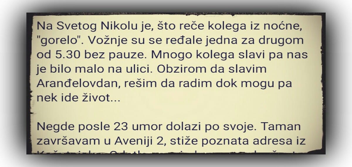 Na Svetog Nikolu je, što reče kolega iz noćne, “gorelo”. Vožnje su se ređale jedna za drugom od 5.30 bez pauze. Mnogo kolega slavi pa…