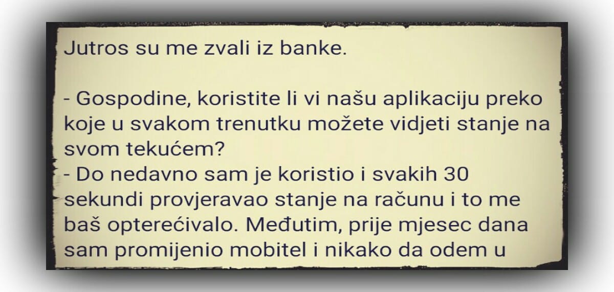 Jutros su me zvali iz banke. – Gospodine, koristite li vi našu aplikaciju preko koje u svakom trenutku možete vidjeti stanje na svom tekućem? –…
