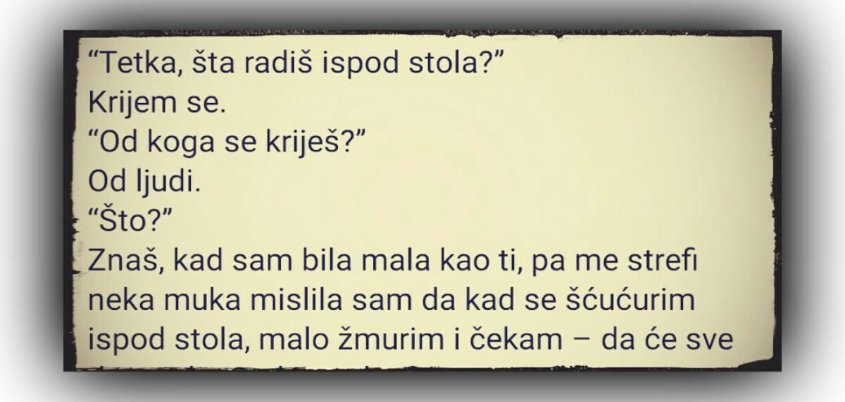 “Tetka, šta radiš ispod stola?” Krijem se. “Od koga se kriješ?” Od ljudi. “Što?” Znaš, kad sam bila mala kao ti, pa me strefi neka…