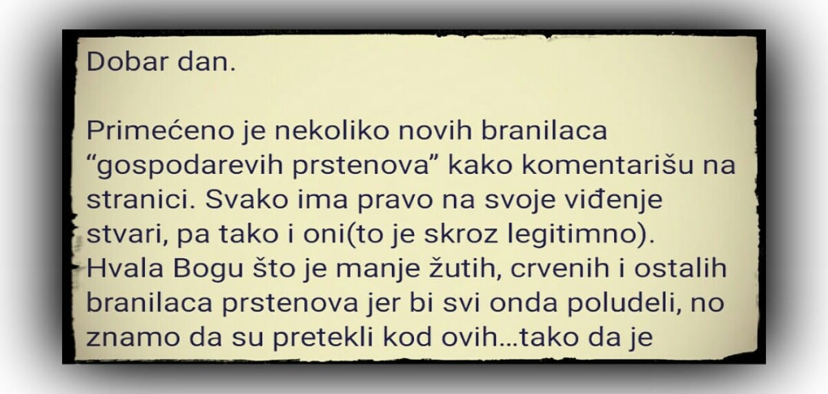 Dobro veče. Primećeno je nekoliko novih branilaca “gospodarevih prstenova” kako komentarišu na stranici. Svako ima pravo na svoje viđenje stvari, pa tako i oni(to je…