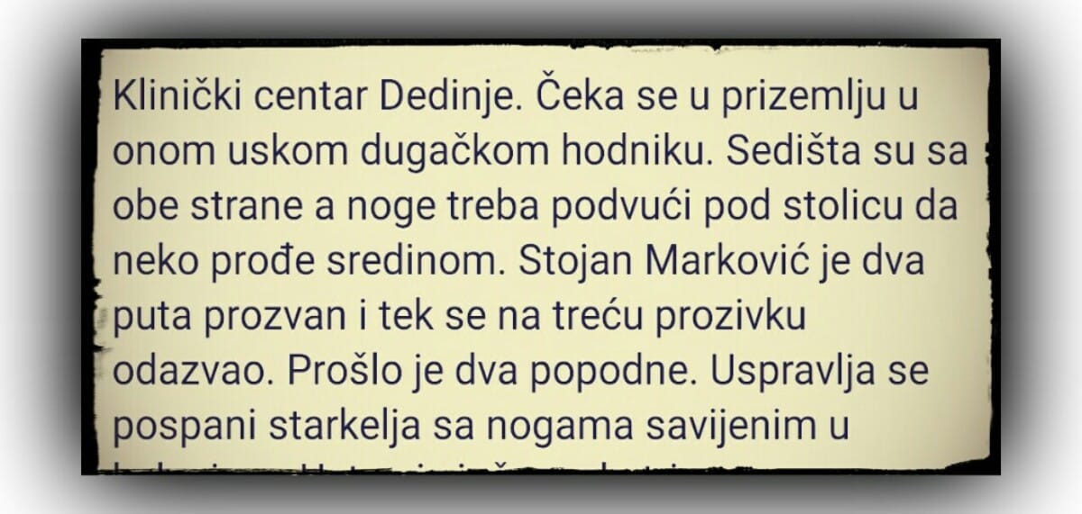 Klinički centar Dedinje. Čeka se u prizemlju u onom uskom dugačkom hodniku. Sedišta su sa obe strane a noge treba podvući pod stolicu da neko…