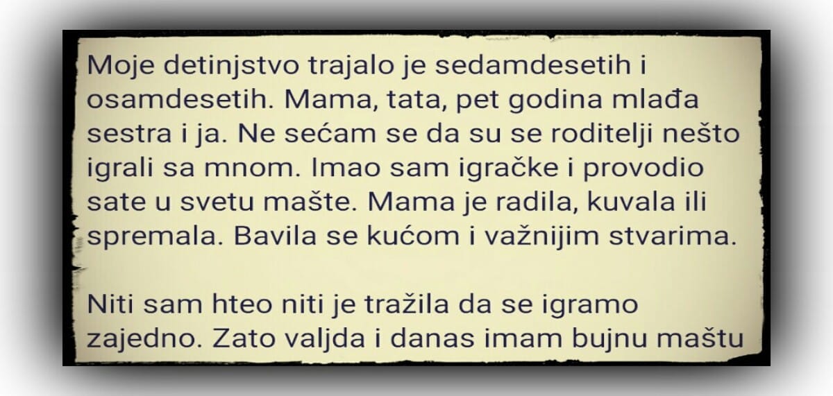 Moje detinjstvo trajalo je sedamdesetih i osamdesetih. Mama, tata, pet godina mlađa sestra i ja. Ne sećam se da su se roditelji nešto igrali sa…