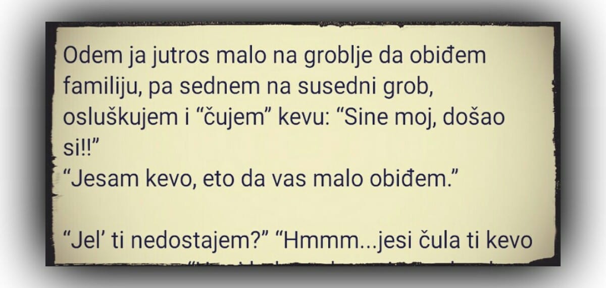 Odem ja jutros malo na groblje da obiđem familiju, pa sednem na susedni grob, osluškujem i “čujem” kevu: “Sine moj, došao si!!” “Jesam kevo, eto…