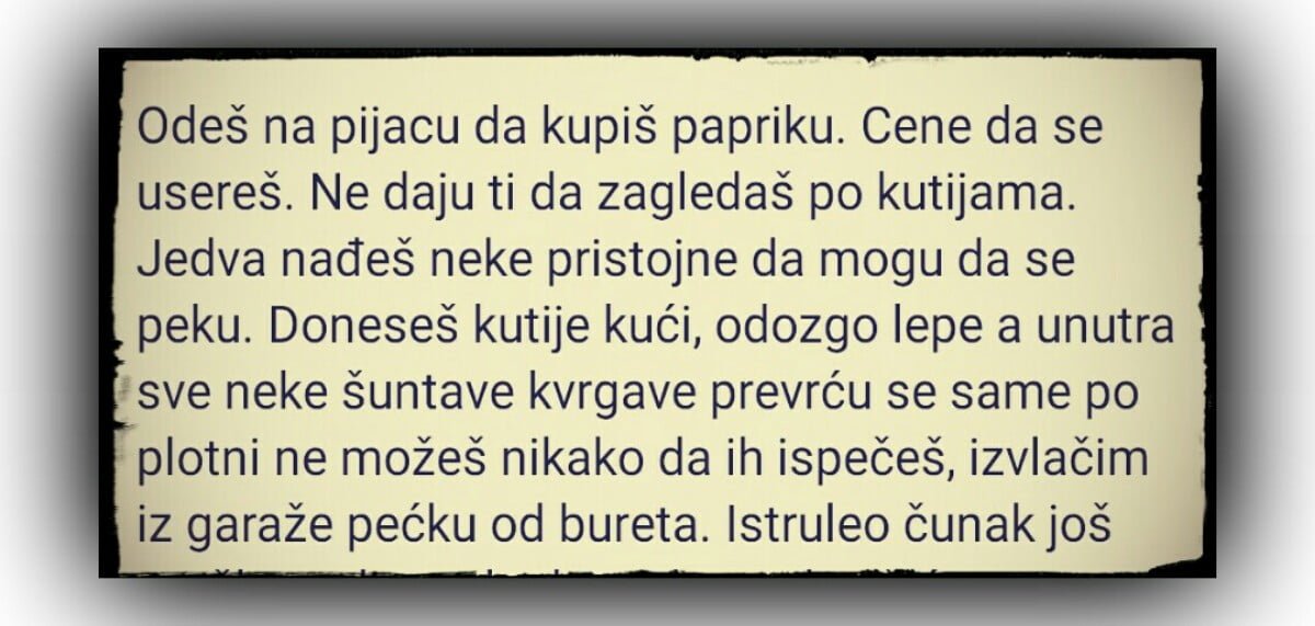 Odeš na pijacu da kupiš papriku. Cene da se usereš. Ne daju ti da zagledaš po kutijama. Jedva nađeš neke pristojne da mogu da se…