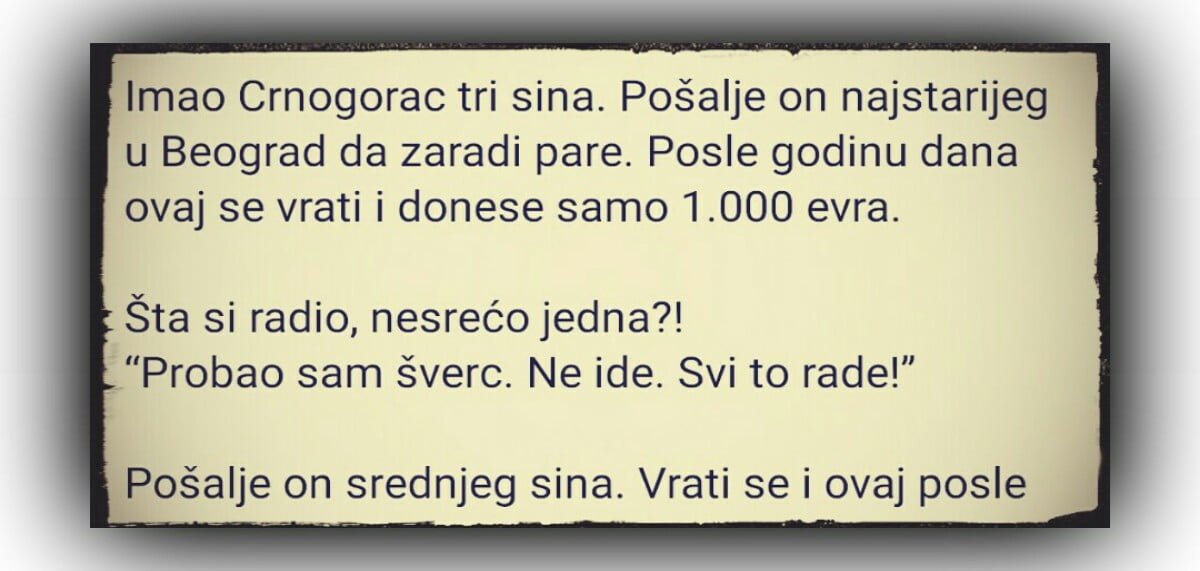 Imao Crnogorac tri sina. Pošalje on najstarijeg u Beograd da zaradi pare. Posle godinu dana ovaj se vrati i donese samo 1.000 evra. Šta si…