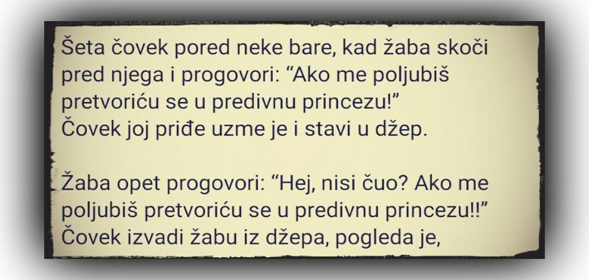 Šeta čovek pored neke bare, kad žaba skoči pred njega i progovori: “Ako me poljubiš pretvoriću se u predivnu princezu!” Čovek joj priđe uzme je…