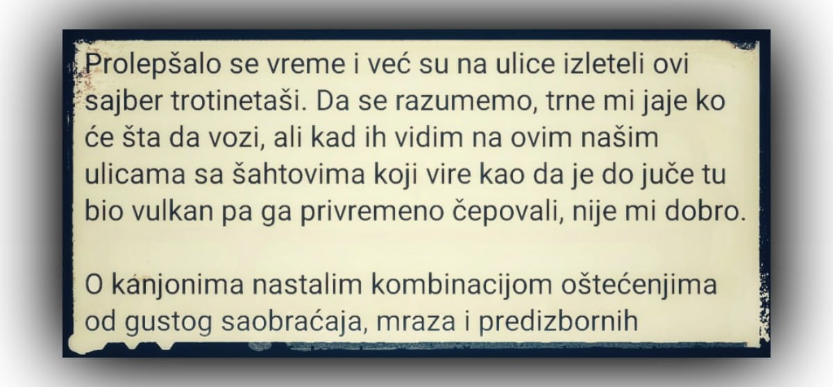 Prolepšalo se vreme i već su na ulice izleteli ovi sajber trotinetaši. Da se razumemo, trne mi jaje ko će šta da vozi, ali kad…