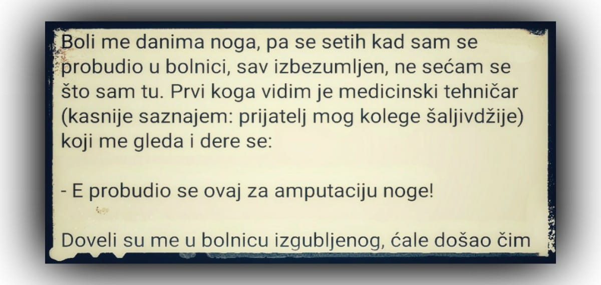 Boli me danima noga, pa se setih kad sam se probudio u bolnici, sav izbezumljen, ne sećam se što sam tu. Prvi koga vidim je…