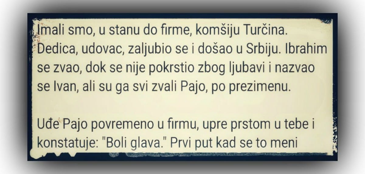 Imali smo, u stanu do firme, komšiju Turčina. Dedica, udovac, zaljubio se i došao u Srbiju. Ibrahim se zvao, dok se nije pokrstio zbog ljubavi…