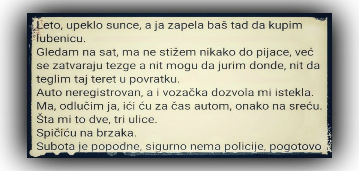 Leto, upeklo sunce, a ja zapela baš tad da kupim lubenicu. Gledam na sat, ma ne stižem nikako do pijace, već se zatvaraju tezge a…