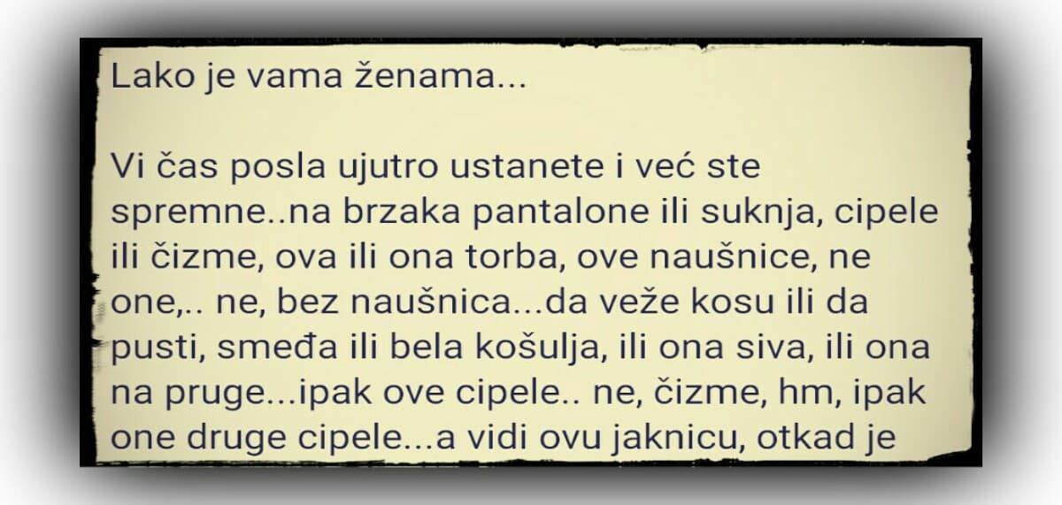 Lako je vama ženama… Vi čas posla ujutro ustanete i već ste spremne..na brzaka pantalone ili suknja, cipele ili čizme, ova ili ona torba, ove…