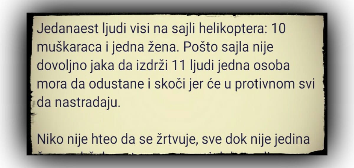 Jedanaest ljudi visi na sajli helikoptera: 10 muškaraca i jedna žena. Pošto sajla nije dovoljno jaka da izdrži 11 ljudi jedna osoba mora da odustane…