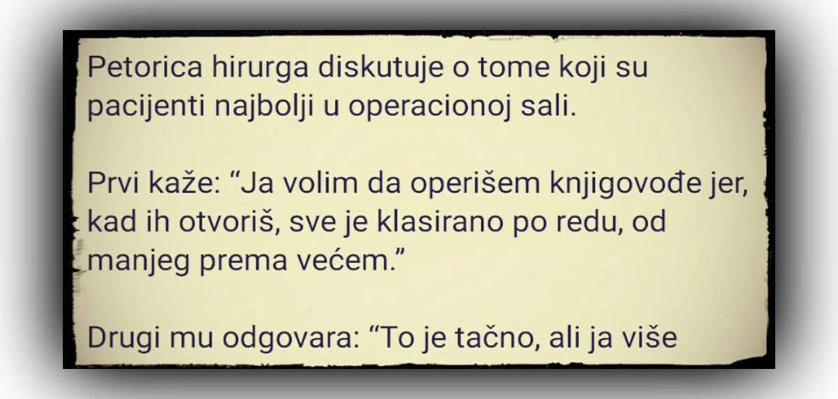 Petorica hirurga diskutuje o tome koji su pacijenti najbolji u operacionoj sali. Prvi kaže: “Ja volim da operišem knjigovođe jer, kad ih otvoriš, sve je…