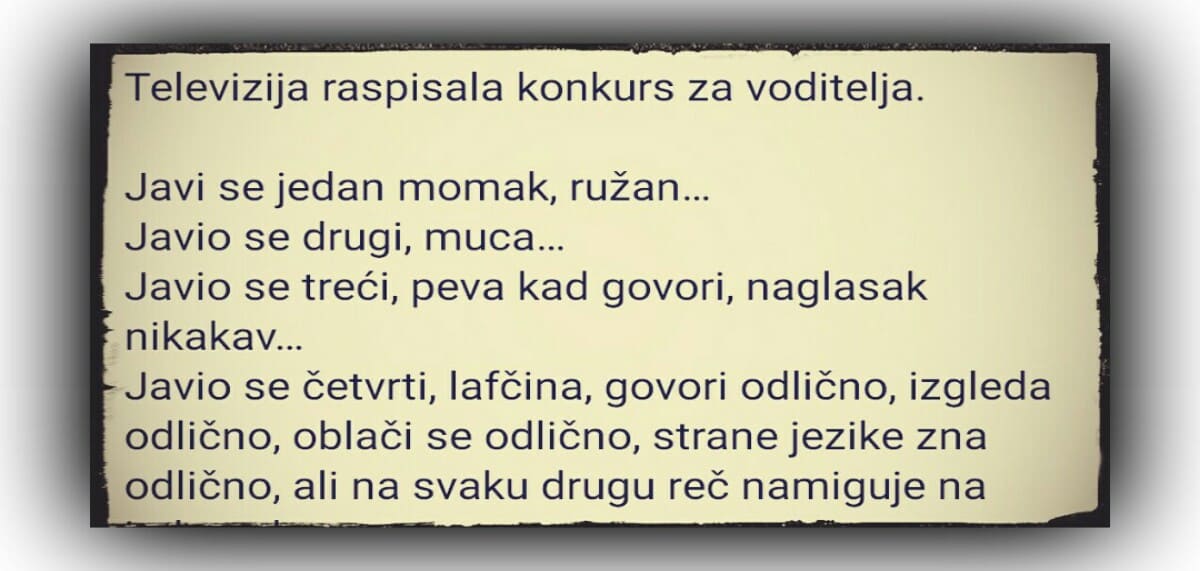 Televizija raspisala konkurs za voditelja. Javi se jedan momak, ružan… Javio se drugi, muca… Javio se treći, peva kad govori, naglasak nikakav… Javio se četvrti,…