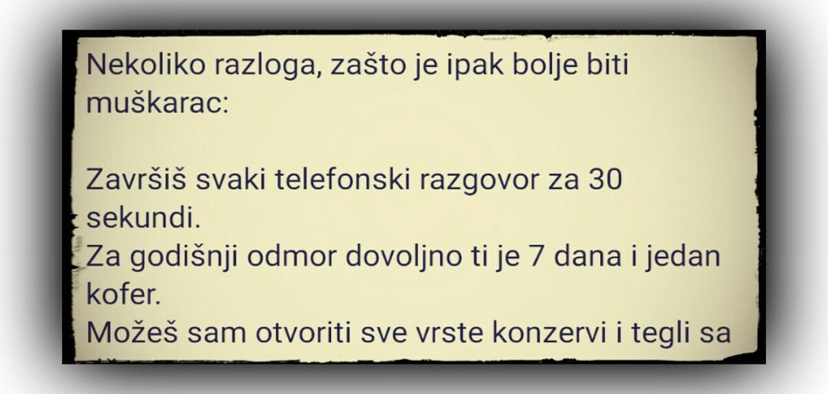 Nekoliko razloga, zašto je ipak bolje biti muškarac: Završiš svaki telefonski razgovor za 30 sekundi. Za godišnji odmor dovoljno ti je 7 dana i jedan…