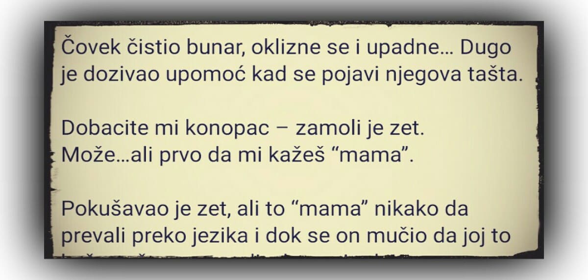 Čovek čistio bunar, oklizne se i upadne… Dugo je dozivao upomoć kad se pojavi njegova tašta. Dobacite mi konopac – zamoli je zet. Može…ali prvo…