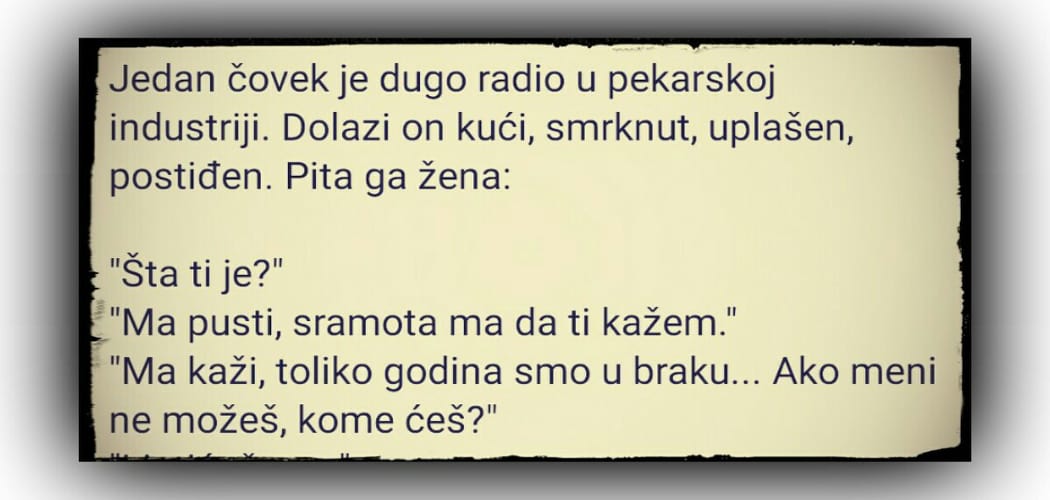 Jedan čovek je dugo radio u pekarskoj industriji. Dolazi on kući, smrknut, uplašen, postiđen. Pita ga žena: “Šta ti je?” “Ma pusti, sramota ma da…
