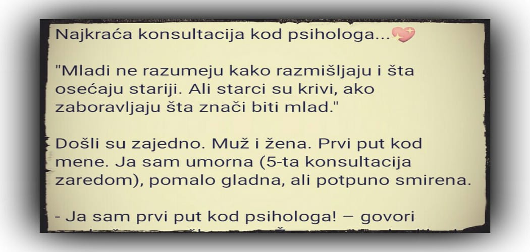 Najkraća konsultacija kod psihologa…💖 “Mladi ne razumeju kako razmišljaju i šta osećaju stariji. Ali starci su krivi, ako zaboravljaju šta znači biti mlad.” Došli su…