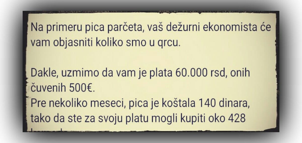 Na primeru pica parčeta, vaš dežurni ekonomista će vam objasniti koliko smo u qrcu. Dakle, uzmimo da vam je plata 60.000 rsd, onih čuvenih 500€.…