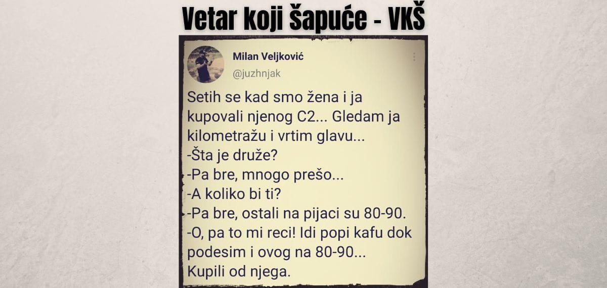 Setih se kad smo žena i ja kupovali njenog C2… Gledam ja kilometražu i vrtim glavu…-Šta je druže?-Pa bre, mnogo prešo…-A koliko bi ti?-Pa bre,…