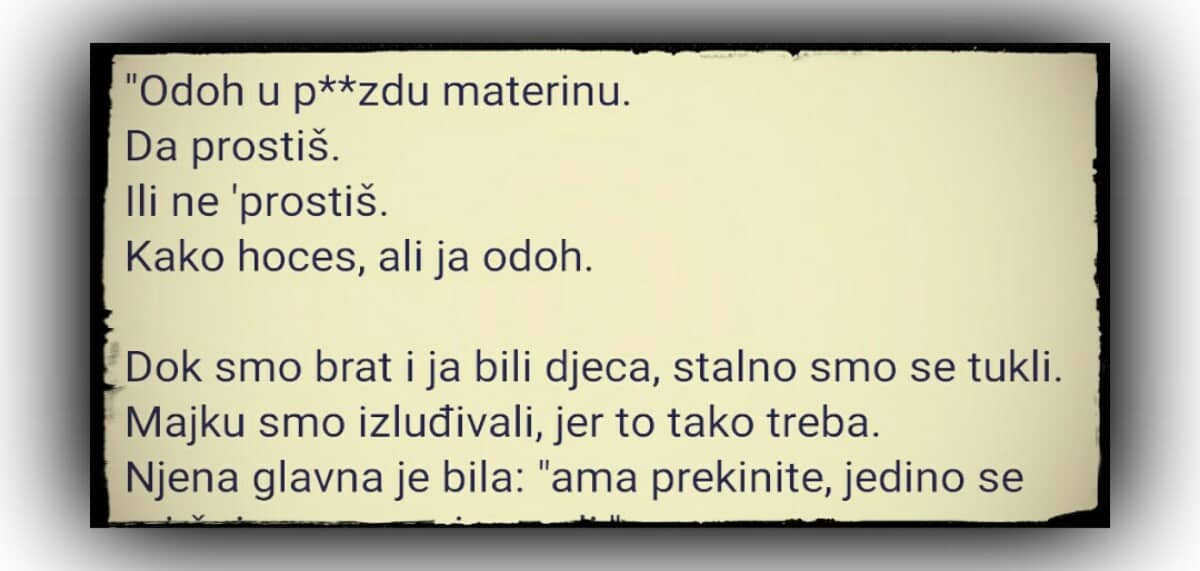 “Odoh u p**zdu materinu. Da prostiš. Ili ne ‘prostiš. Kako hoces, ali ja odoh. Dok smo brat i ja bili djeca, stalno smo se tukli.…