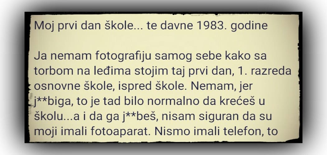 Moj prvi dan škole… te davne 1983. godine Ja nemam fotografiju samog sebe kako sa torbom na leđima stojim taj prvi dan, 1. razreda osnovne…