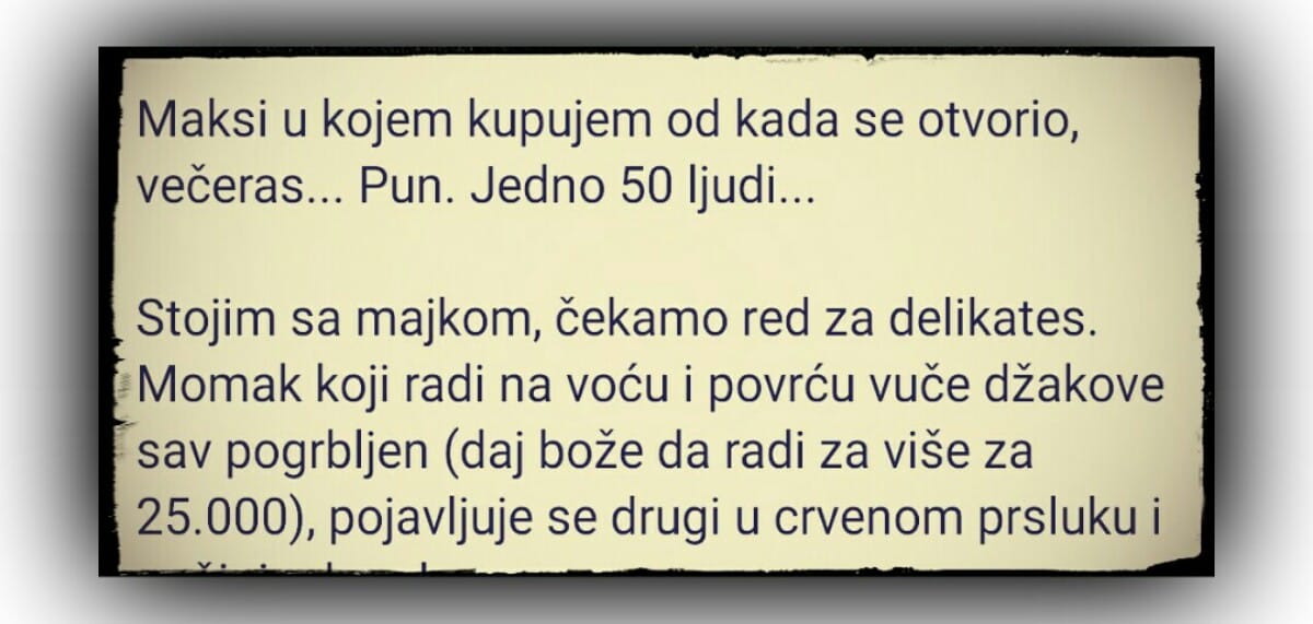 Maksi u kojem kupujem od kada se otvorio, večeras… Pun. Jedno 50 ljudi… Stojim sa majkom, čekamo red za delikates. Momak koji radi na voću…