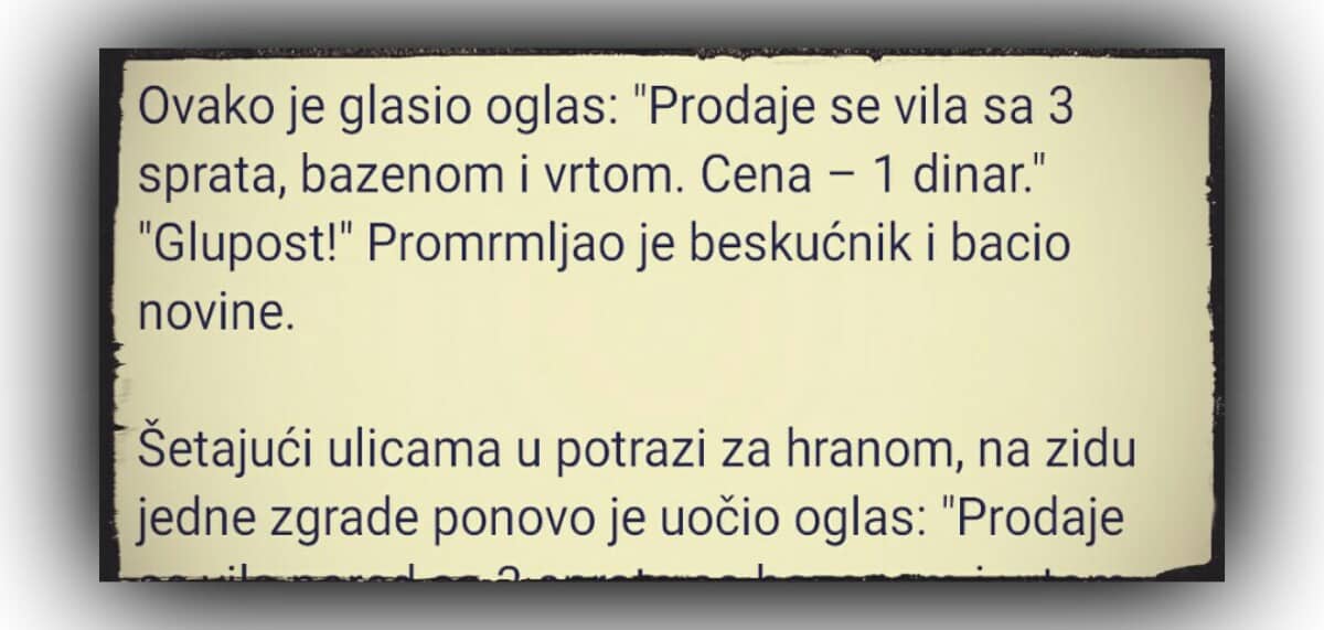 Ovako je glasio oglas: “Prodaje se vila sa 3 sprata, bazenom i vrtom. Cena – 1 dinar.” “Glupost!” Promrmljao je beskućnik i bacio novine. Šetajući…