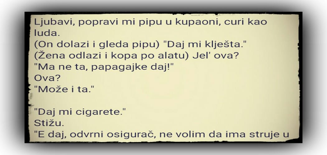 (On dolazi i gleda pipu) “Daj mi klješta.”