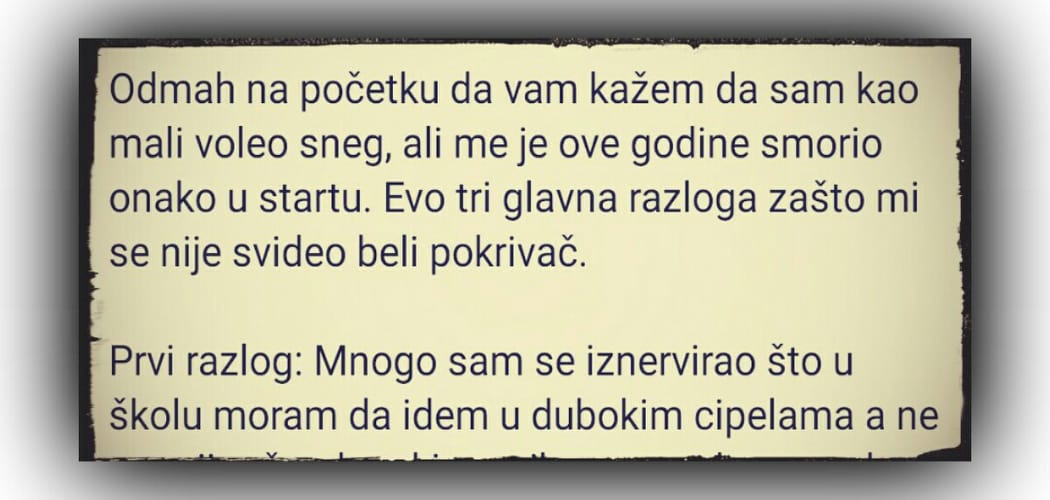 Treći razlog: Časovi nisu skraćeni. Prošle godine kada je tokom noći napadalo brdo snega, svi su bili u frci. Kao da su padale bombe a ne sneg. Uhvatila ih prpa što su morali mnogo da čiste i lopataju da put do škole bude prohodan. Da vam kažem iskreno, nekako mi je draže da čistim sneg ispred škole nego da sedim u njoj i pišem ovakve pismene zadatke. To čišćenje mu dođe nešto kao fizičko vaspitanje.