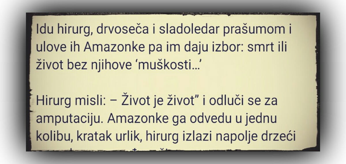 Amazonka pristane i on je upita: “Zašto je hirurg bio tako brzo gotov, a kod drvoseče je to potrajalo?”