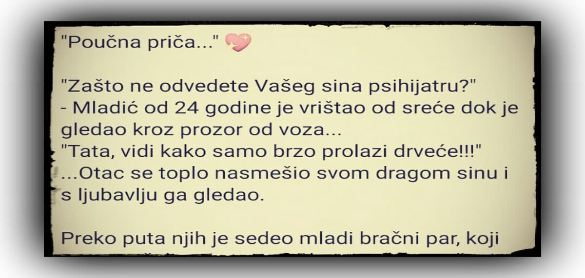 Preko puta njih je sedeo mladi bračni par, koji su sa sažaljenjem pratili detinjasto ponašanje mladića…
