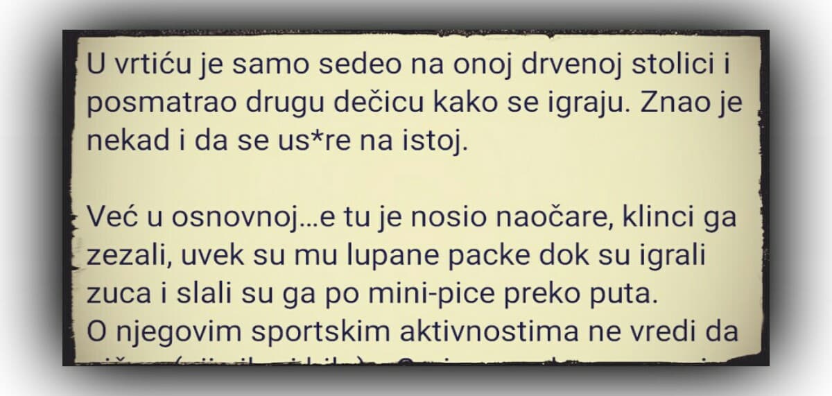 Već u osnovnoj…e tu je nosio naočare, klinci ga zezali, uvek su mu lupane packe dok su igrali zuca i slali su ga po mini-pice preko puta.