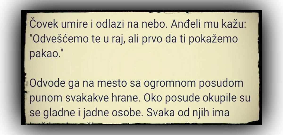 Čovek umire i odlazi na nebo. Anđeli mu kažu: “Odvešćemo te u raj, ali prvo da ti pokažemo pakao.”