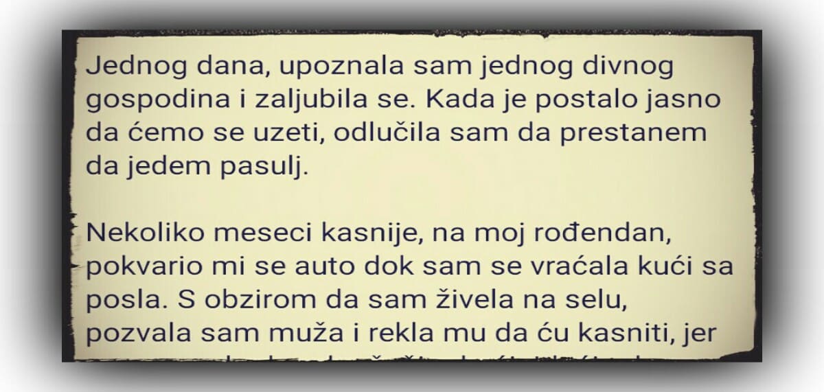 Nekoliko meseci kasnije, na moj rođendan, pokvario mi se auto dok sam se vraćala kući sa posla. S obzirom da sam živela na selu, pozvala sam muža i rekla mu da ću kasniti, jer sam morala da odpešačim kući. Idući tako, uz put sam naišla na jednu malu krčmu iz koje se širio miris pasulja i ja jednostavno nisam mogla da odolim.